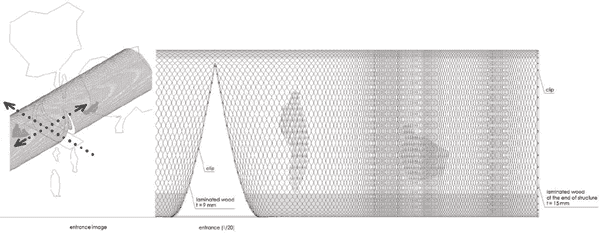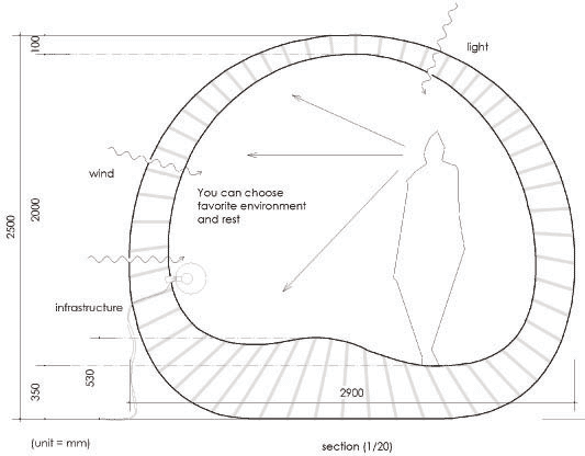 | ■Sweet SIESTAの構造は、内径1900mm、外径2500mmの円筒状断面をもつ紙製ハニカム構造である。 ■全体が分散して荷重を支えることにより、柱梁、床・壁・天井の区別ない連続的空間が生まれる。 ■ハニカムの柔軟性を利用して、自由な形状をつくりだせる。地形に沿って変形し、いかなる敷地にも建設可能である。 ■外部に開かれており、光の変化、空気の動きが内部空間に反映される。 |